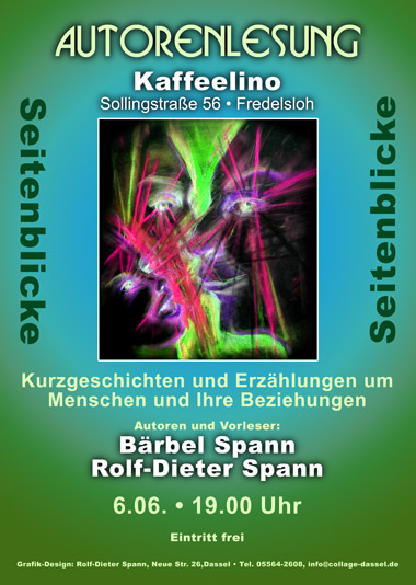 2. August 2015 Ausstellung und Lesung im Hof der Collage. Bärbel und Rolf-Dieter Spann stellten einen Teil ihrer Werke auf dem mit Pflanzen gemütlich gestalteten Hof aus. Bärbel Spann zeigte ihre "Baumgesichter", Rolf-Dieter Spann Bilder, Zeichnungen, Holzschnitte, Collagen sowie Holz und Steinskulpturen. In der Lesung trug Bärbel einige Geschichten aus ihrem neuen Buch "Tage wie dieser" mit humorvoll akzentuierten kleinen und größeren Katastrophen einer "normalen" Familie vor. Rol-Dieter ergänzte das Programm mit Gedichten zum Thema Liebe, Nachbarschaft und Familie.