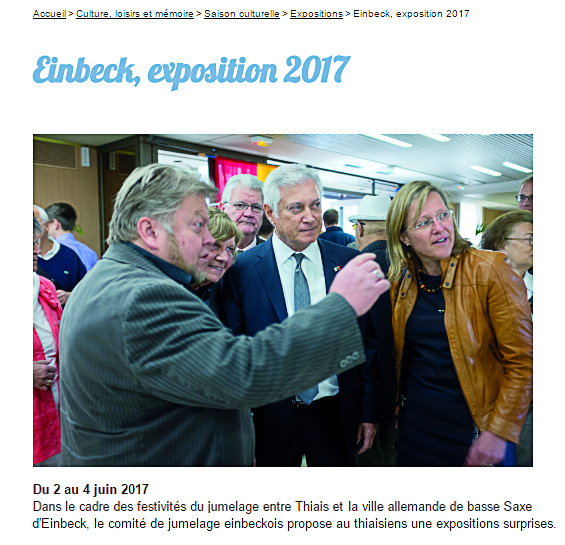 Die Partnerstadt von Einbeck (Künstler des Kunsthauses Collage sind auch Mitglieder des Kunsthauses Einbeck) Thiais lädt die Künstler nach der gelungenen Ausstellung 2015 auch 2017 wieder ein, ihre aktuellen Werke zu zeigen und Niedersachsen künstlerisch zu vertreten.