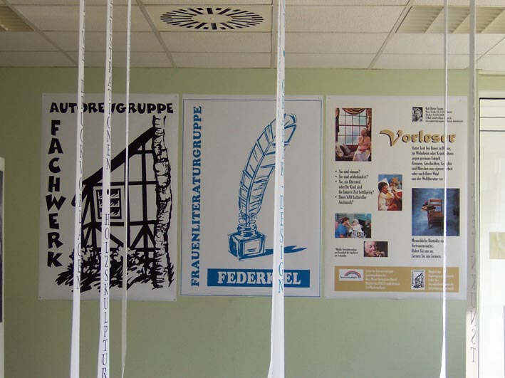 | 20.02. | Lesung der Autorengruppe Fachwerk und der Frauenliteraturgruppe Federkiel mit Musik und Bilderausstellung im Cafe Klett, Fredelsloh. Bilderausstellung der Malgruppe "Herbstfarben" |
